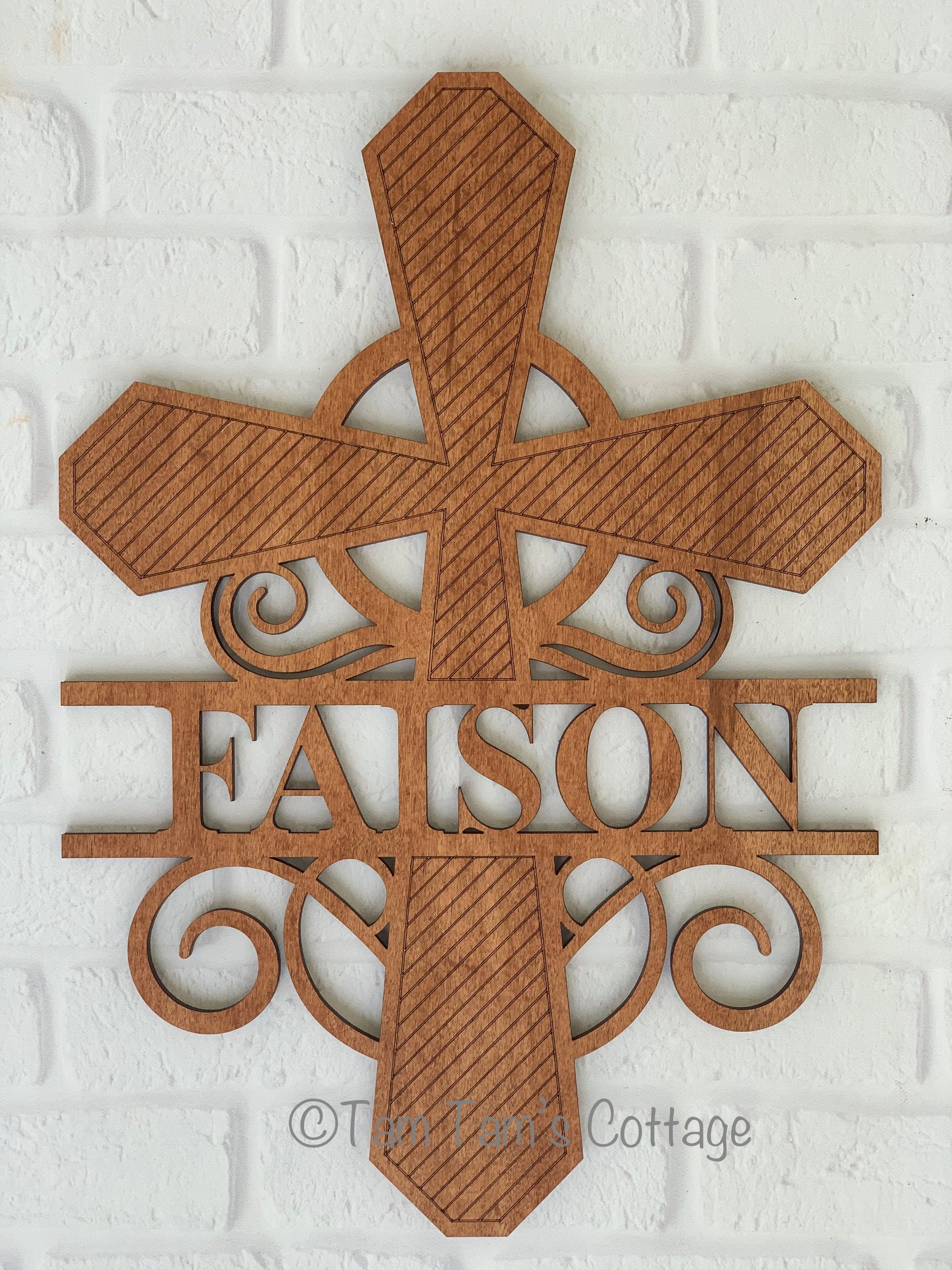 This personalized wood split letter cross is a meaningful way to showcase your family name or a special word of your choice. Stained in your selected color or left natural, it adds a warm, custom touch to any shelf or mantel. Measuring 10.75" wide by 15" high, this cross blends faith and style, making it a heartfelt gift or a distinctive accent for your home décor.